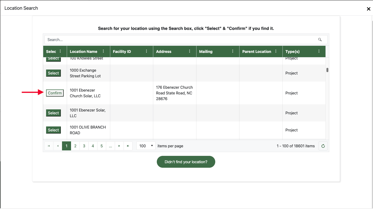 If you find your site/facility/location, click on the "Select" button, and then again on the "Confirm" button