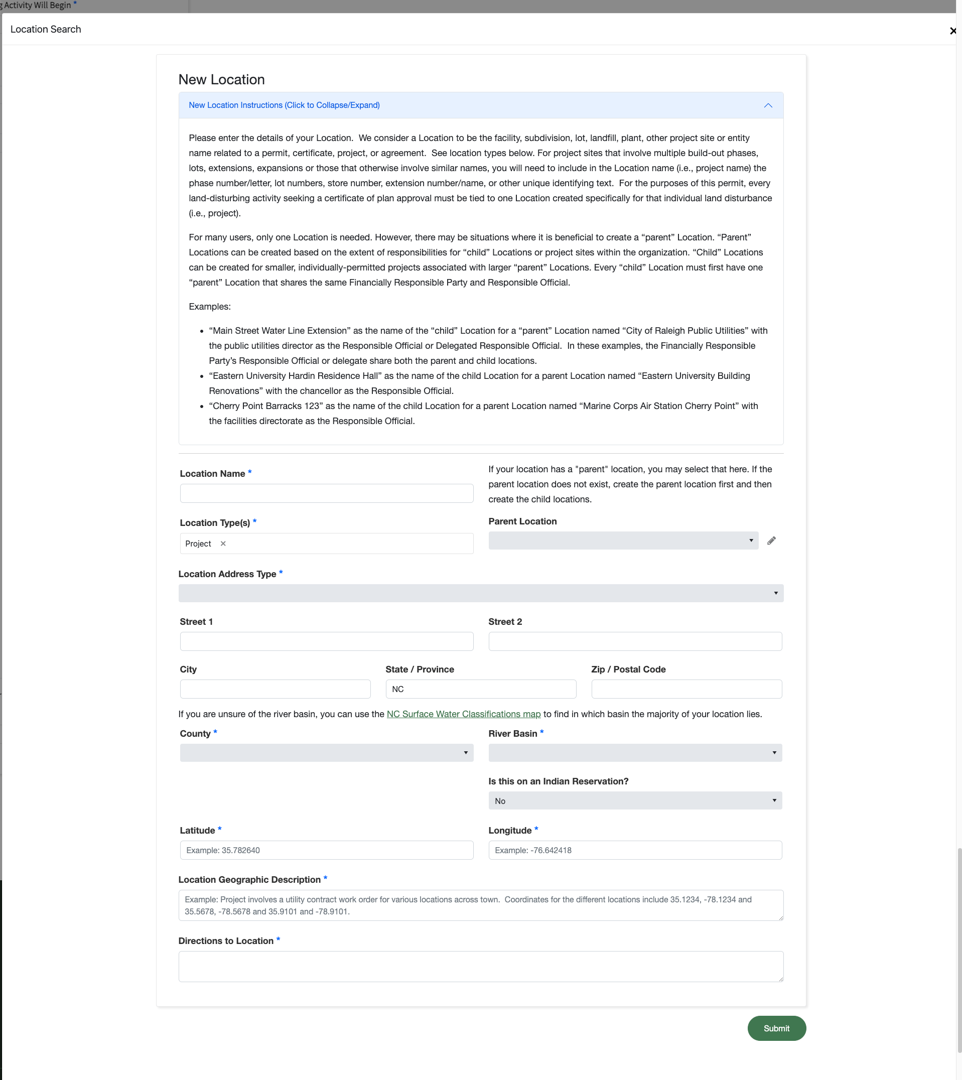Each program may use a slightly different "Add Location" detail screen. For example, the Erosion & Sediment Control" permit application uses a much more detailed location description because often there is no street address.