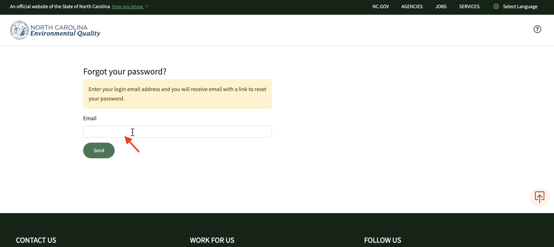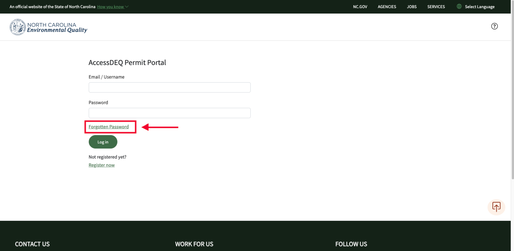 To reset, go to the AccessDEQ portal, located at https://portal.deq.nc.gov, and click on the “Forgotten Password” link located just above the “Log-in” button