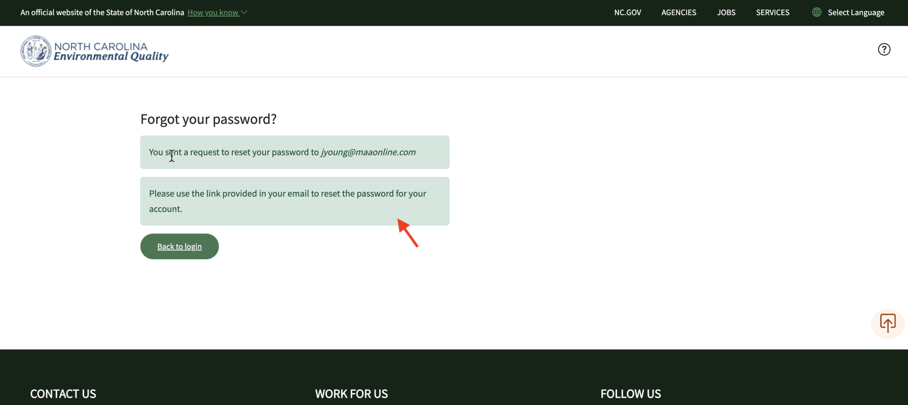 Go to your email inbox, and check for an email sent from our portal. The subject line of this email should display something like “North Carolina Access DEQ Password Changed”.